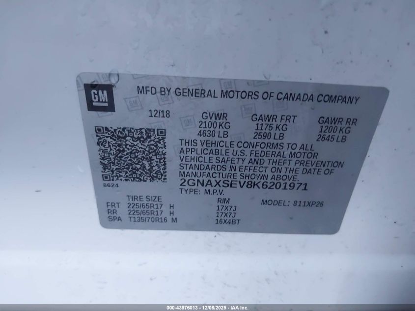 Цвет БелыйЦилиндры 4Привод Полный приводVIN 2GNAXSEV8K6201971Состояние Заводится и едет (проверено)Повреждения Передняя или задняя