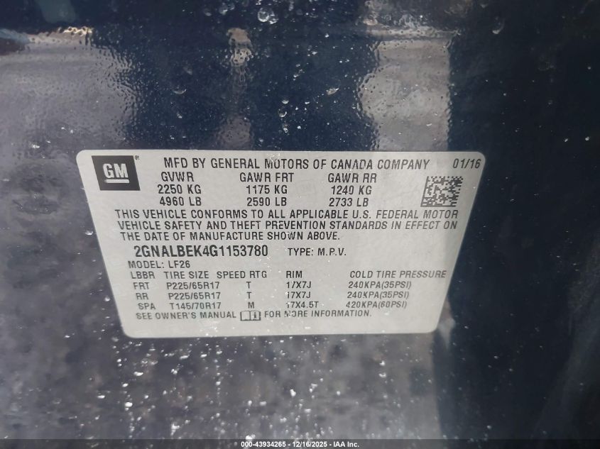 2016 CHEVROLET EQUINOX - 2GNALBEK4G1153780, цвет - Синий, 2.4, Бензин, Передний привод из США