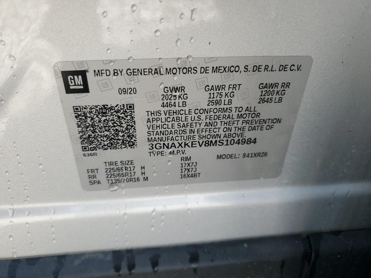 Цвет СеребряныйЦилиндры 4VIN 3GNAXKEV8MS104984Состояние Заводится и едет (проверено)Повреждения Передняя или задняяДата аукциона 2025-10-07