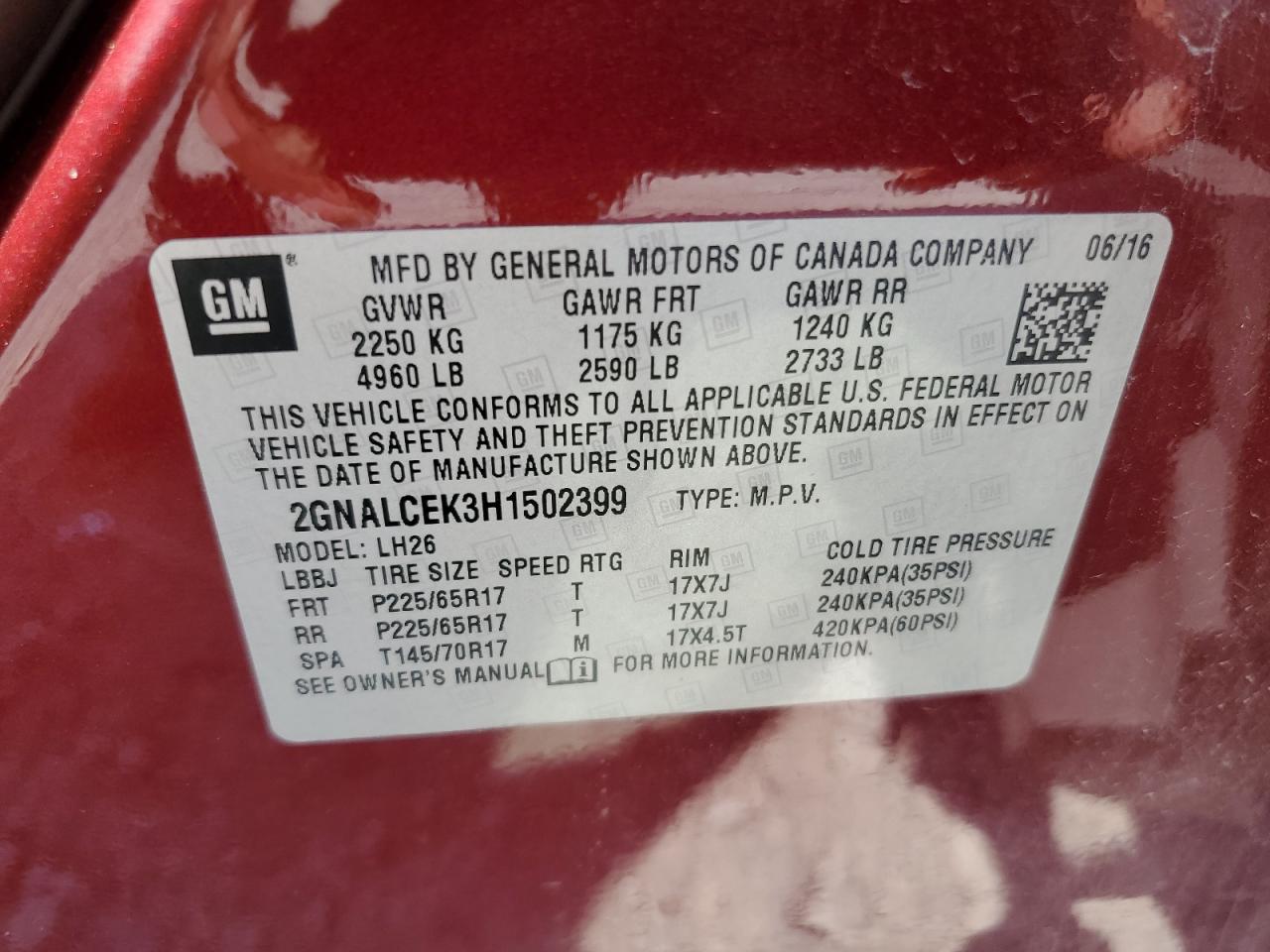 Цвет БордовыйЦилиндры 4VIN 2GNALCEK3H1502399Состояние НеизвестноПовреждения Передняя или задняя
