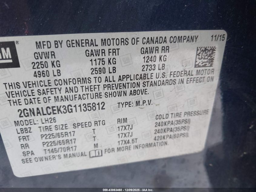 2016 CHEVROLET EQUINOX - 2GNALCEK3G1135812, цвет - Синий, 2.4, Бензин, Передний привод из США