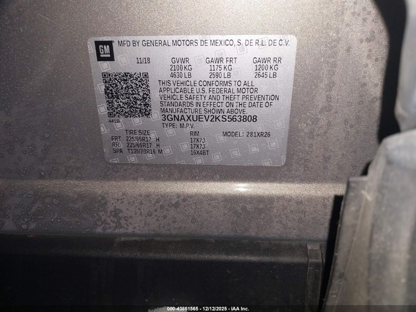 2019 CHEVROLET EQUINOX - 3GNAXUEV2KS563808, цвет - Серый, 1.5, Бензин, Полный привод из США