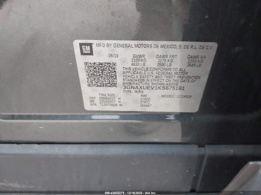 2019 CHEVROLET EQUINOX - 3GNAXUEV1KS675161, цвет - , 1.5, Бензин, Полный привод из США