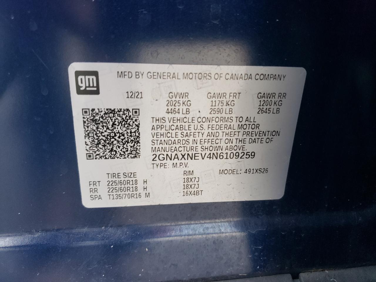 2022 CHEVROLET EQUINOX - 2GNAXNEV4N6109259, цвет - Синий, 1.5, Бензин, из США