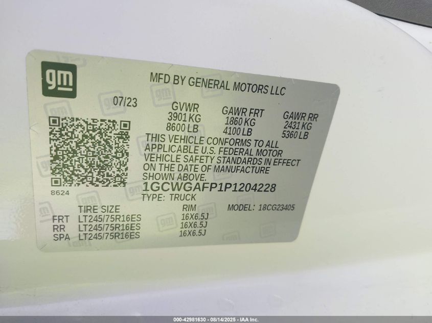 2023 CHEVROLET EXPRESS - 1GCWGAFP1P1204228, цвет - Белый, 4.3, Бензин, Задний привод из США