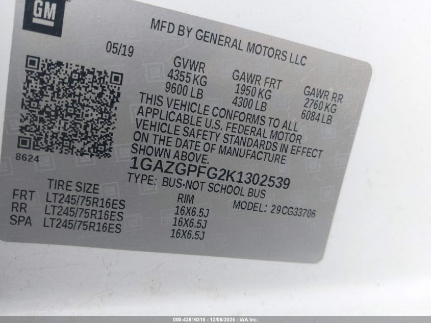 2019 CHEVROLET EXPRESS - 1GAZGPFG2K1302539, цвет - Белый, 6.0, Бензин, Задний привод из США