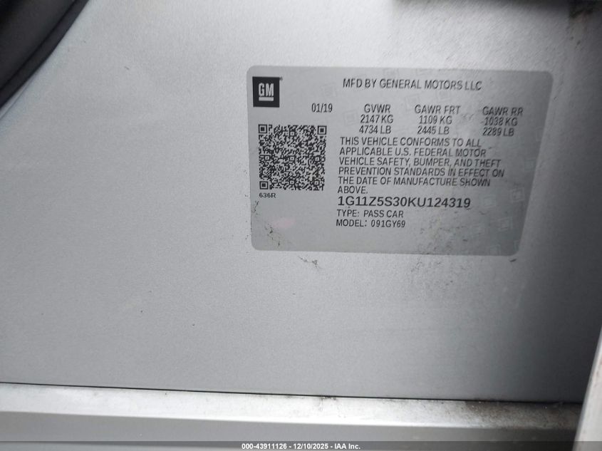 2019 CHEVROLET IMPALA - 1G11Z5S30KU124319, цвет - Серебряный, 3.6, Бензин, Передний привод из США