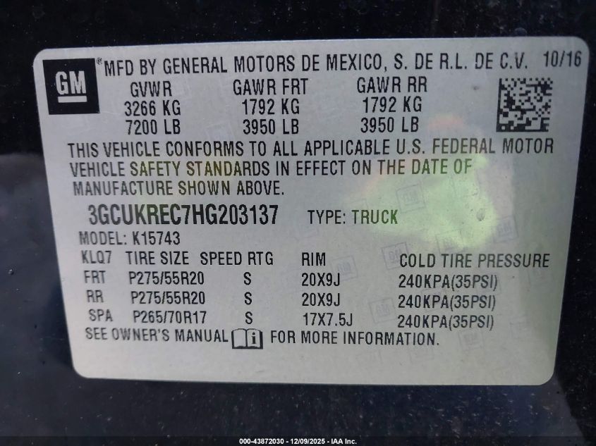 Цвет ЧерныйЦилиндры 8Привод Полный приводVIN 3GCUKREC7HG203137Состояние Заводится и едет (проверено)Повреждения Передняя или задняя