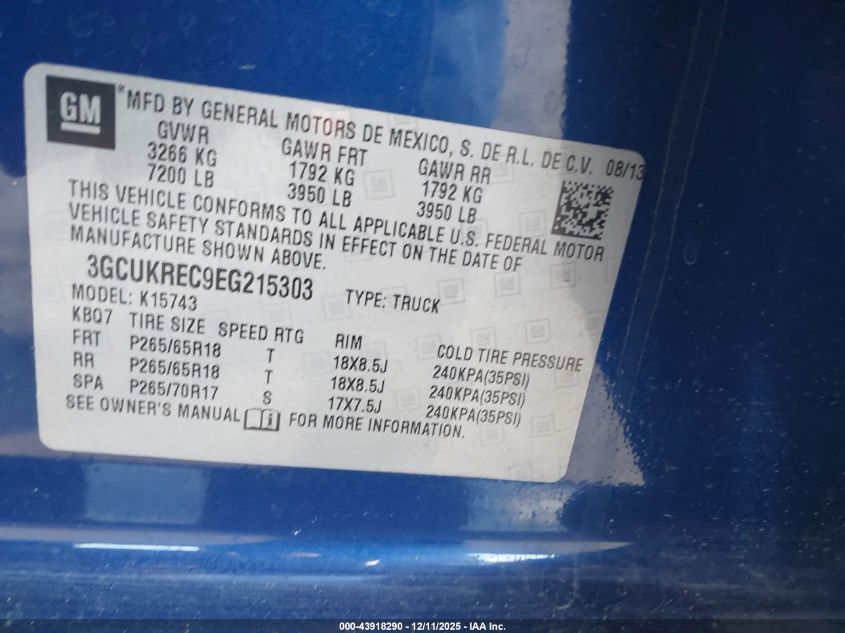 Цвет СинийЦилиндры 8Привод Полный приводVIN 3GCUKREC9EG215303Состояние СтационарноПовреждения Передняя или задняя