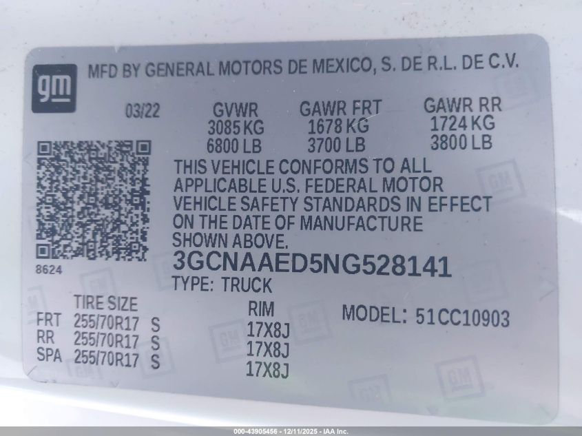 2022 CHEVROLET SILVERADO 1500 - 3GCNAAED5NG528141, цвет - Синий, 5.3, Бензин, из США