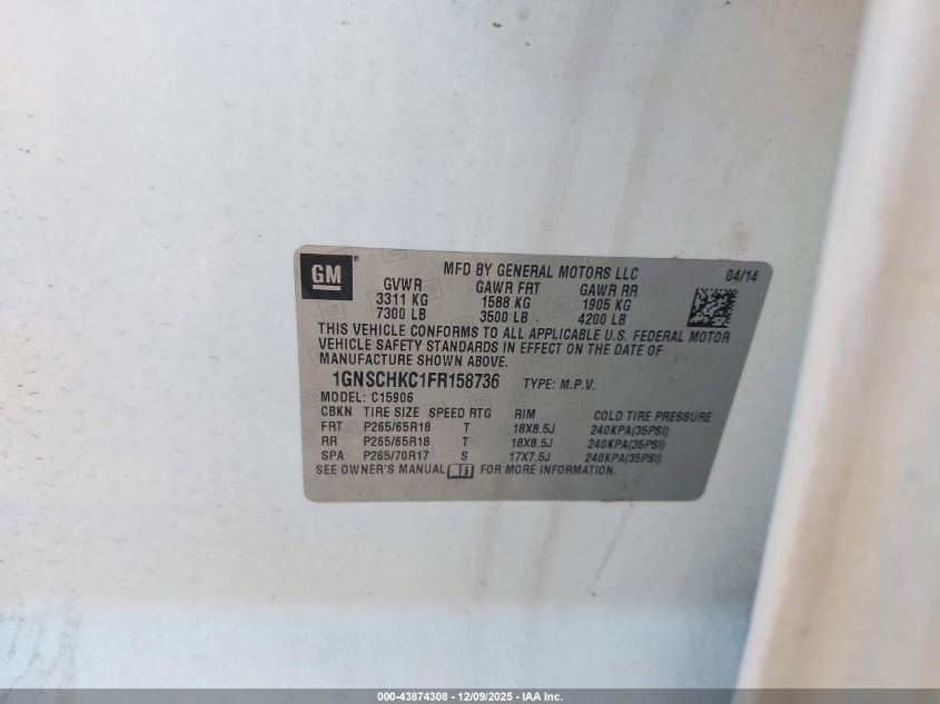 2015 CHEVROLET SUBURBAN - 1GNSCHKC1FR158736, цвет - Белый, 5.3, Бензин, из США