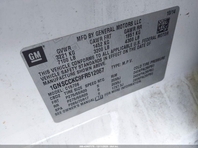 2015 CHEVROLET TAHOE - 1GNSCCKC9FR512067, цвет - Белый, 5.3, Бензин, из США