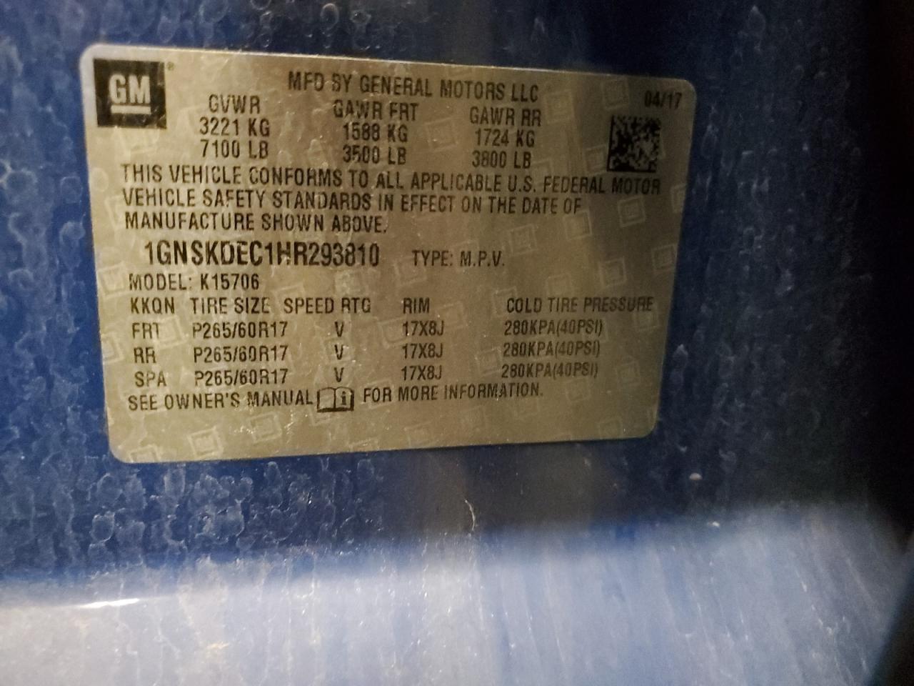 Цвет СинийЦилиндры 8Привод 4x4 с задним приводомVIN 1GNSKDEC1HR293810Состояние Заводится и едет (проверено)Повреждения НезначительныеДата аукциона 2025-10-09