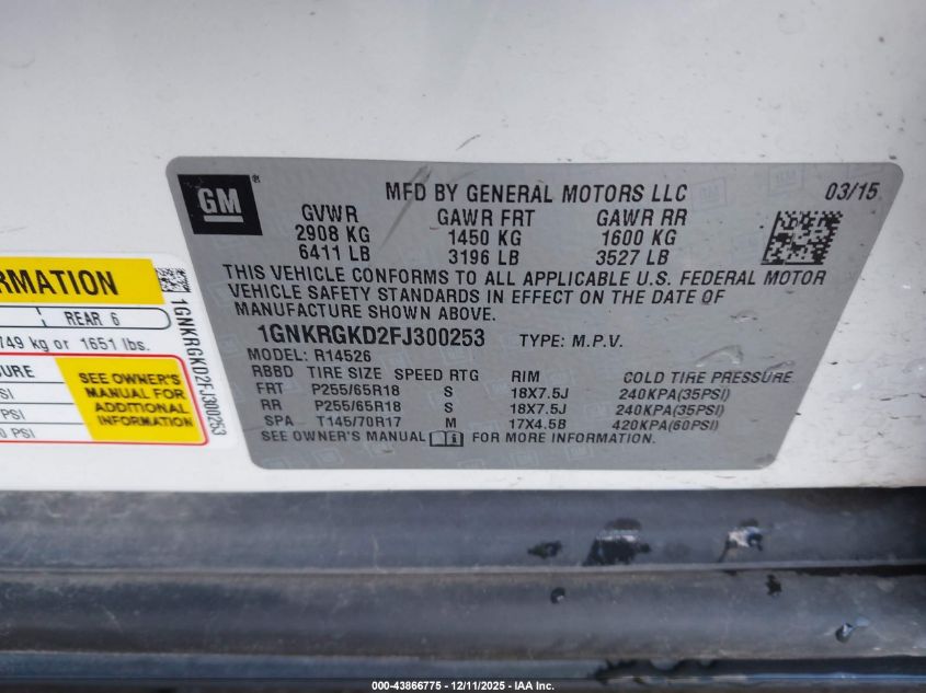 Цвет БелыйЦилиндры 6Привод Передний приводVIN 1GNKRGKD2FJ300253Состояние Заводится и едет (проверено)Повреждения Передняя или задняя