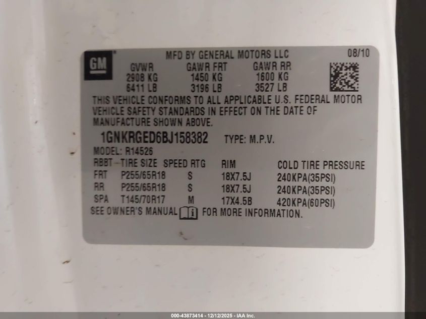 2011 CHEVROLET TRAVERSE - 1GNKRGED6BJ158382, цвет - Белый, 3.6, Бензин, Передний привод из США