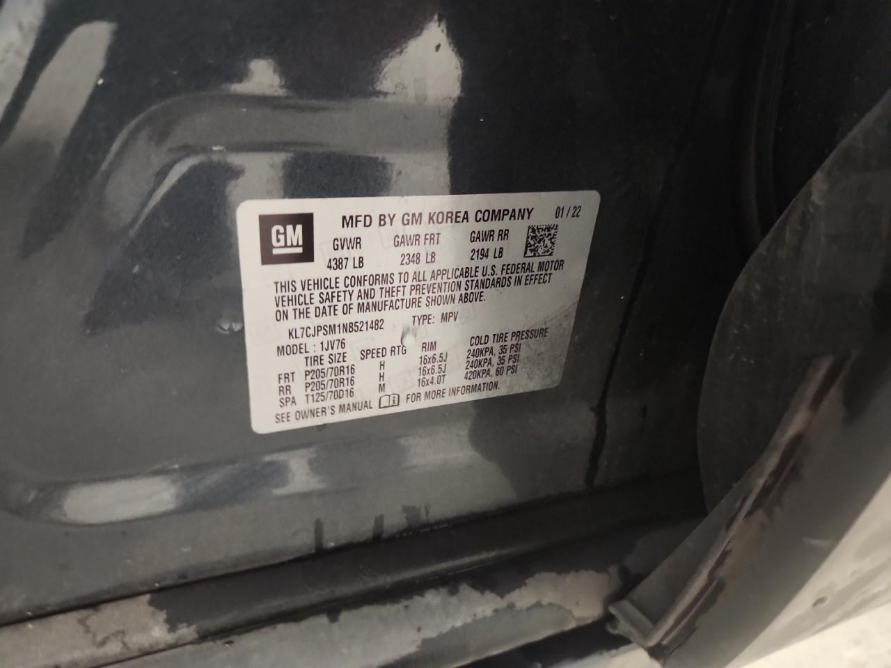 Цвет СинийЦилиндры 4Привод Полный приводVIN KL7CJPSM1NB521482Состояние Заводится и едет (проверено)Повреждения Передняя или задняяДата аукциона 2025-10-09
