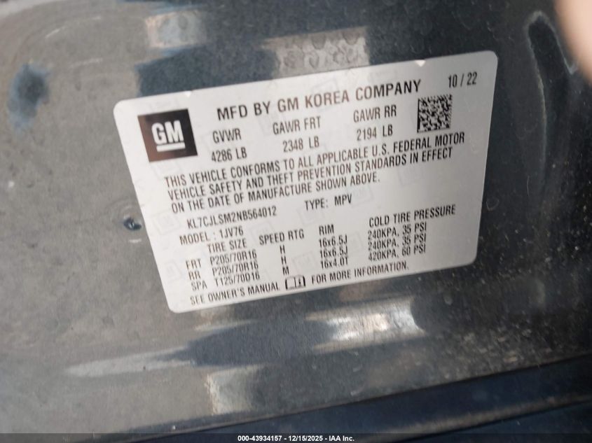 2022 CHEVROLET TRAX - KL7CJLSM2NB564012, цвет - , 1.4, Бензин, Передний привод из США
