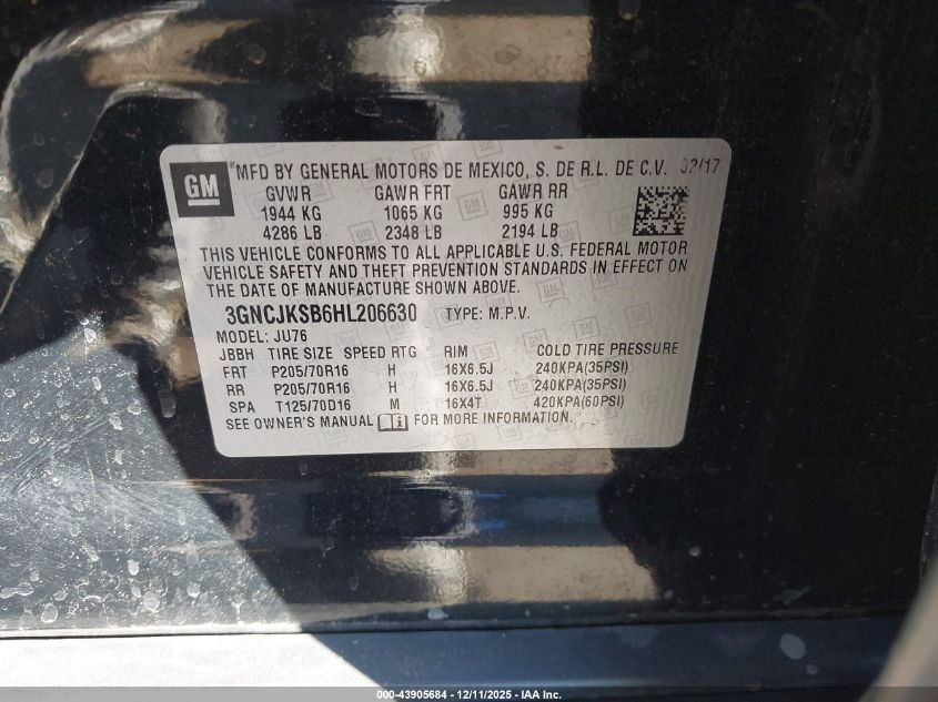 2017 CHEVROLET TRAX - 3GNCJKSB6HL206630, цвет - Черный, 1.4, Бензин, Передний привод из США