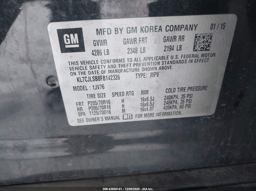 2015 CHEVROLET TRAX - KL7CJLSB8FB142326, цвет - Черный, 1.4, Бензин, Передний привод из США