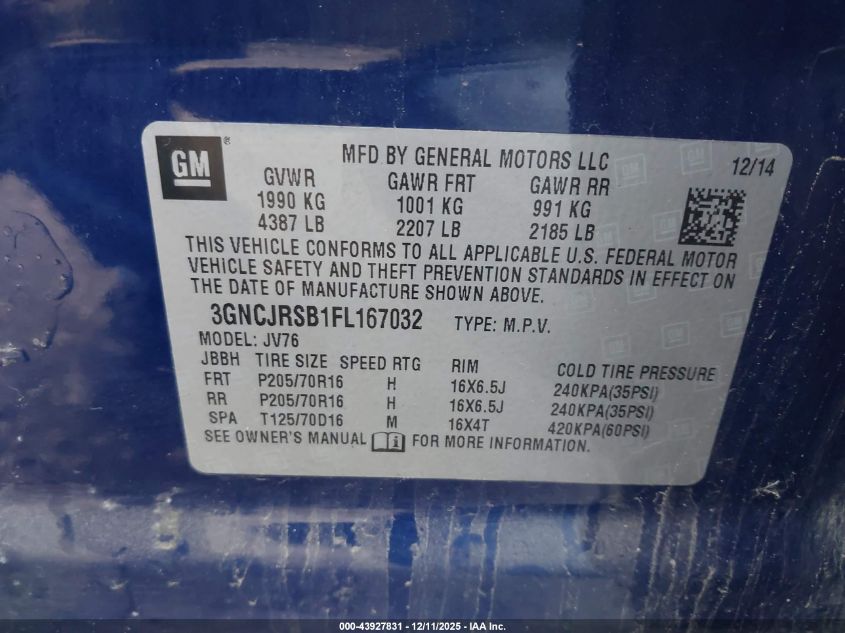 Цвет БежевыйЦилиндры 4Привод Полный приводVIN 3GNCJRSB1FL167032Состояние СтационарноПовреждения Правая сторона
