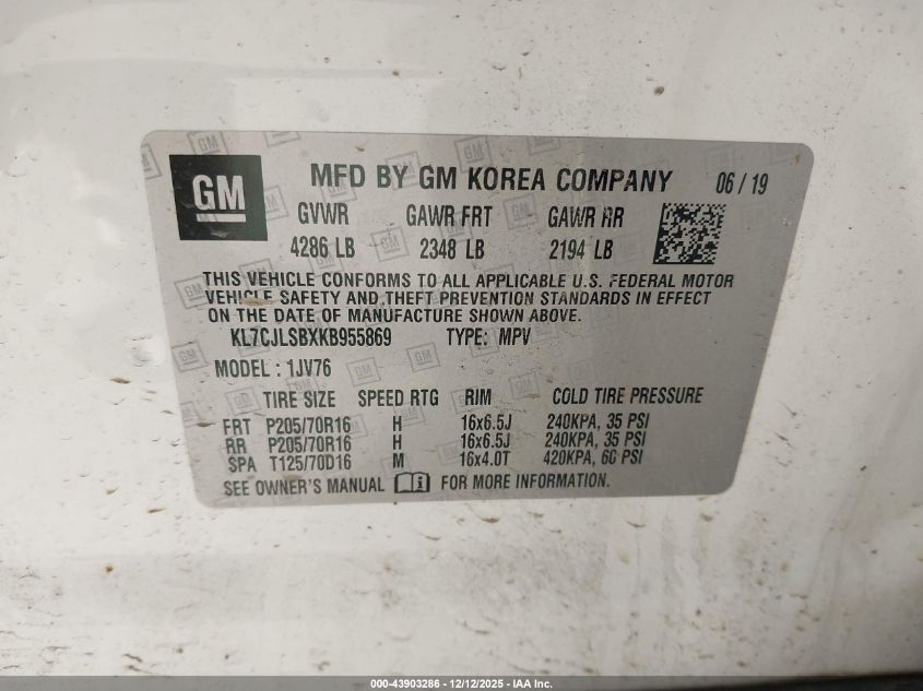 2019 CHEVROLET TRAX - KL7CJLSBXKB955869, цвет - Белый, 1.4, Бензин, Передний привод из США