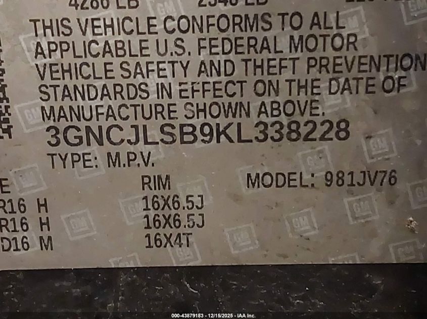 2019 CHEVROLET TRAX - 3GNCJLSB9KL338228, цвет - Черный, 1.4, Бензин, Передний привод из США