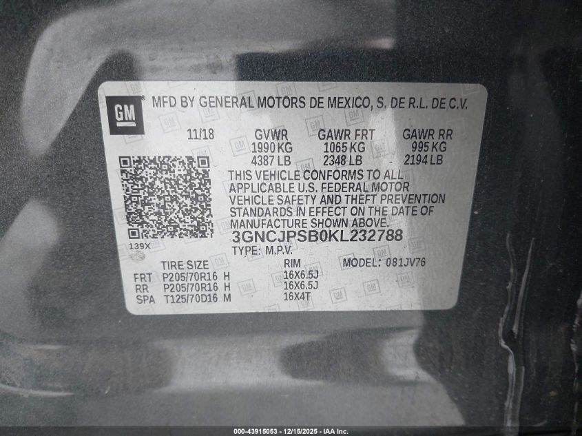 2019 CHEVROLET TRAX - 3GNCJPSB0KL232788, цвет - Серый, 1.4, Бензин, Полный привод из США