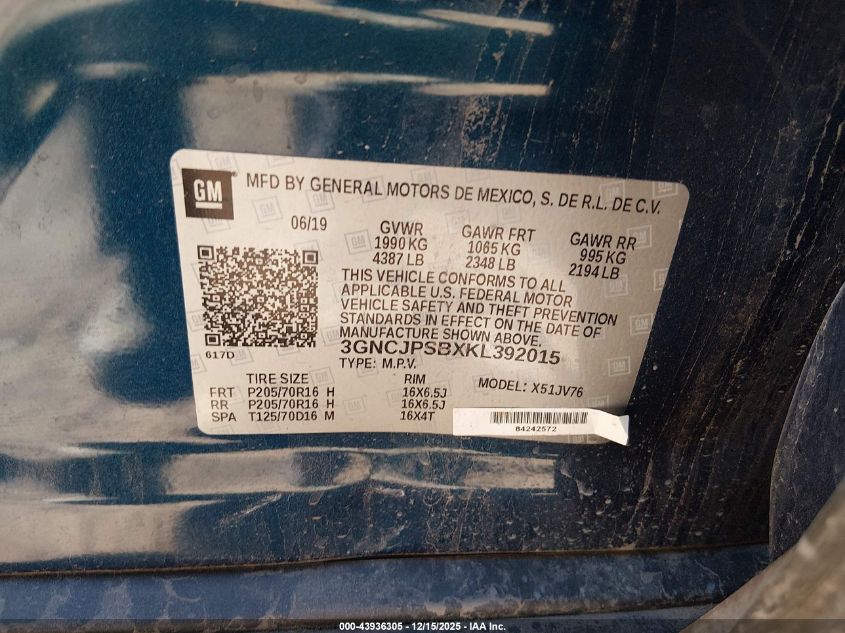 Цвет СинийЦилиндры 4Привод Полный приводVIN 3GNCJPSBXKL392015Состояние СтационарноПовреждения Передняя или задняя
