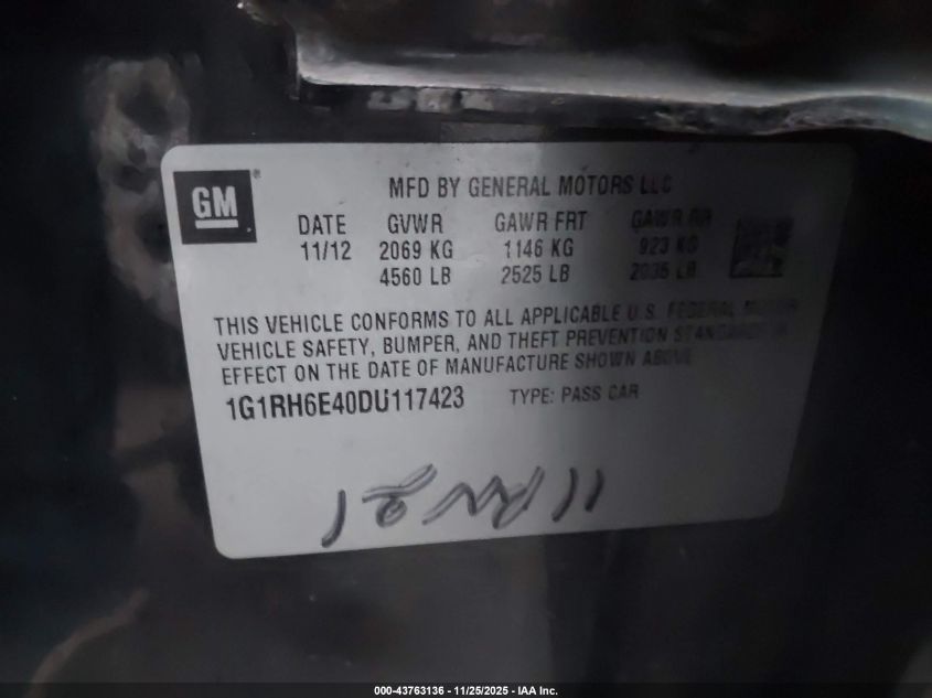 Цвет ЧерныйЦилиндры 4Привод Передний приводVIN 1G1RH6E40DU117423Состояние НеизвестноПовреждения Передняя или задняя