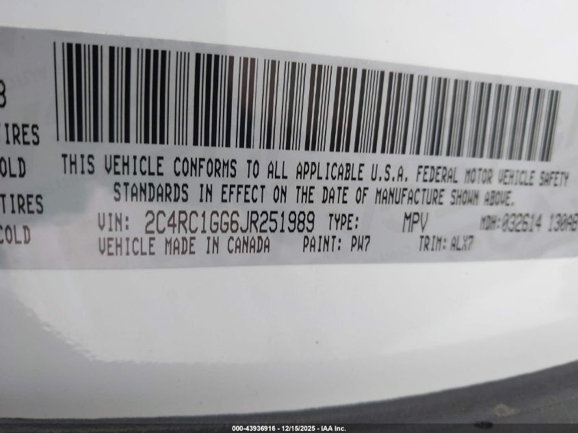Цвет БелыйЦилиндры 6Привод Передний приводVIN 2C4RC1GG6JR251989Состояние СтационарноПовреждения Передняя правая