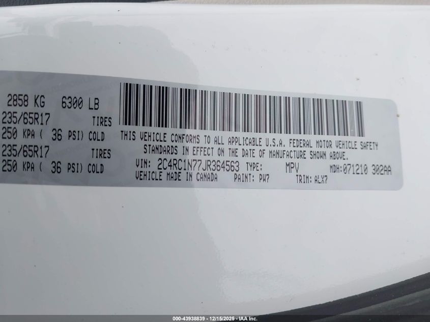 Цвет БелыйЦилиндры 6Привод Передний приводVIN 2C4RC1N77JR364563Состояние СтационарноПовреждения Передняя или задняя