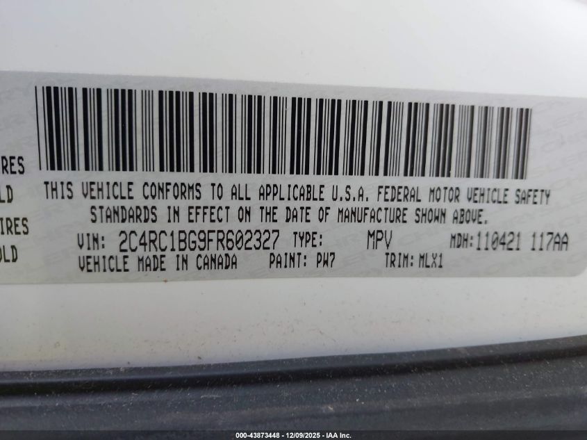 2015 CHRYSLER TOWN & COUNTRY - 2C4RC1BG9FR602327, цвет - Белый, 3.6, Бензин, Передний привод из США