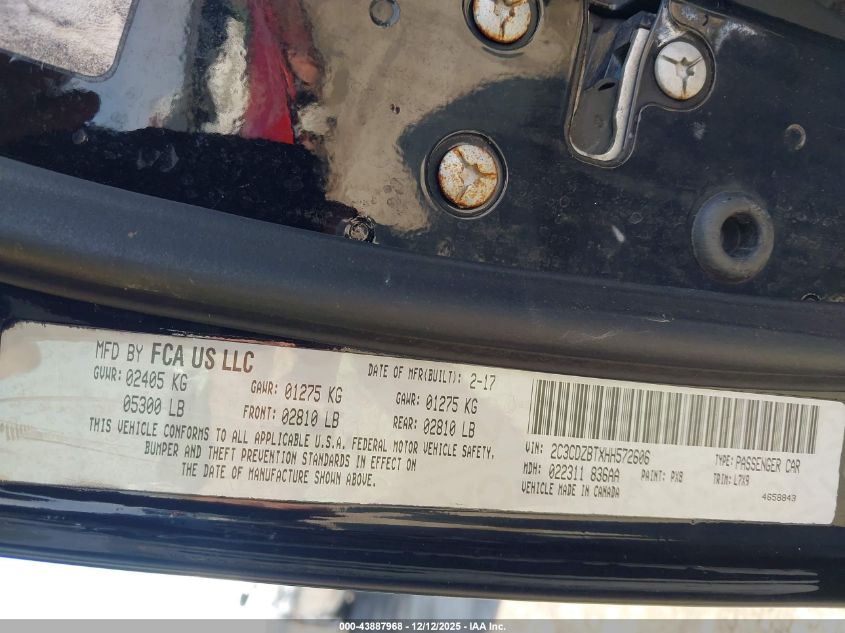Цвет ЧерныйЦилиндры 8Привод Задний приводVIN 2C3CDZBTXHH572606Состояние Заводится и едет (проверено)Повреждения Передняя правая