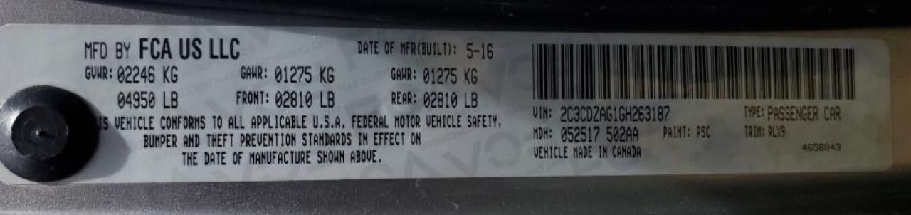 Цвет СерыйЦилиндры 6Привод Задний приводVIN 2C3CDZAG1GH263187Состояние ЗаводитсяПовреждения Передняя или задняя