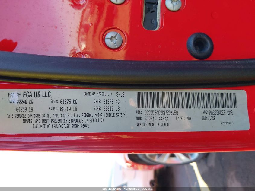 2019 DODGE CHALLENGER - 2C3CDZAG3KH530158, цвет - Красный, 3.6, Бензин, Задний привод из США