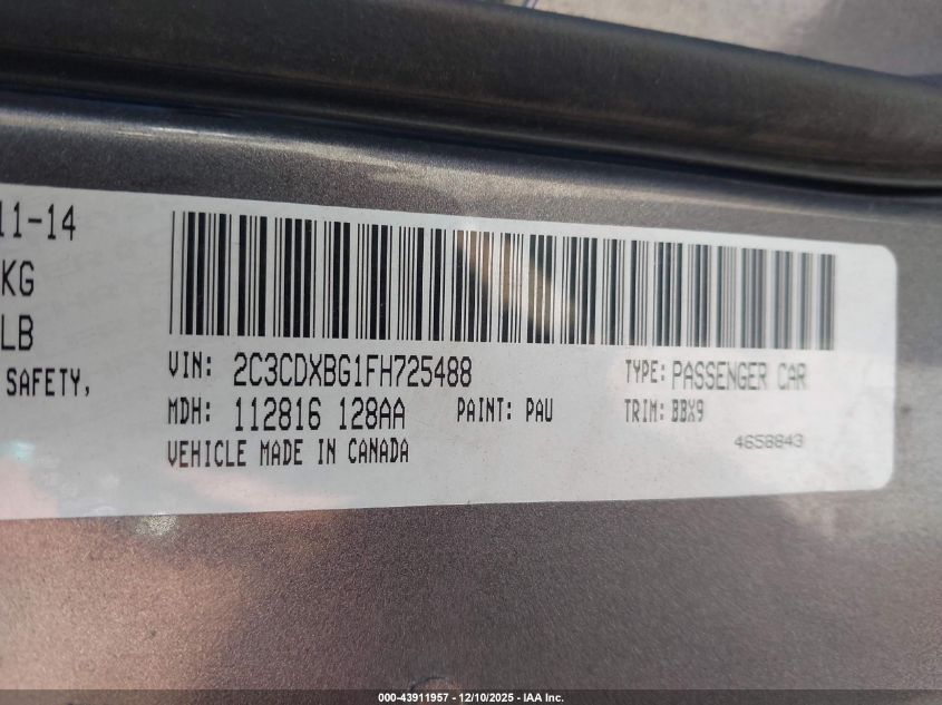 Цвет СерыйЦилиндры 6Привод Задний приводVIN 2C3CDXBG1FH725488Состояние СтационарноПовреждения Передняя правая