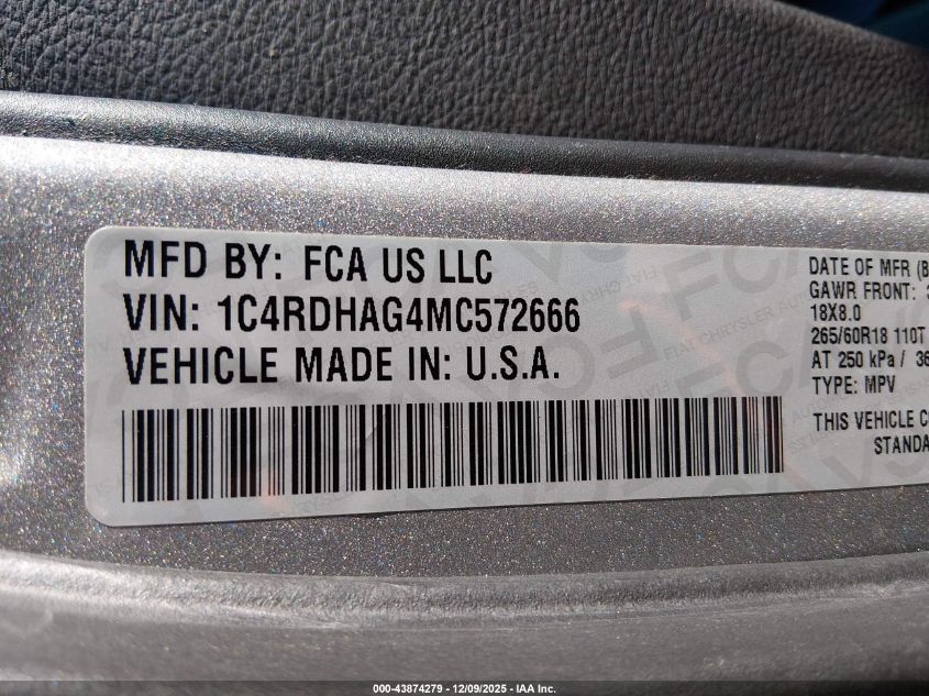 2021 DODGE DURANGO - 1C4RDHAG4MC572666, цвет - Серый, 3.6, Бензин, из США