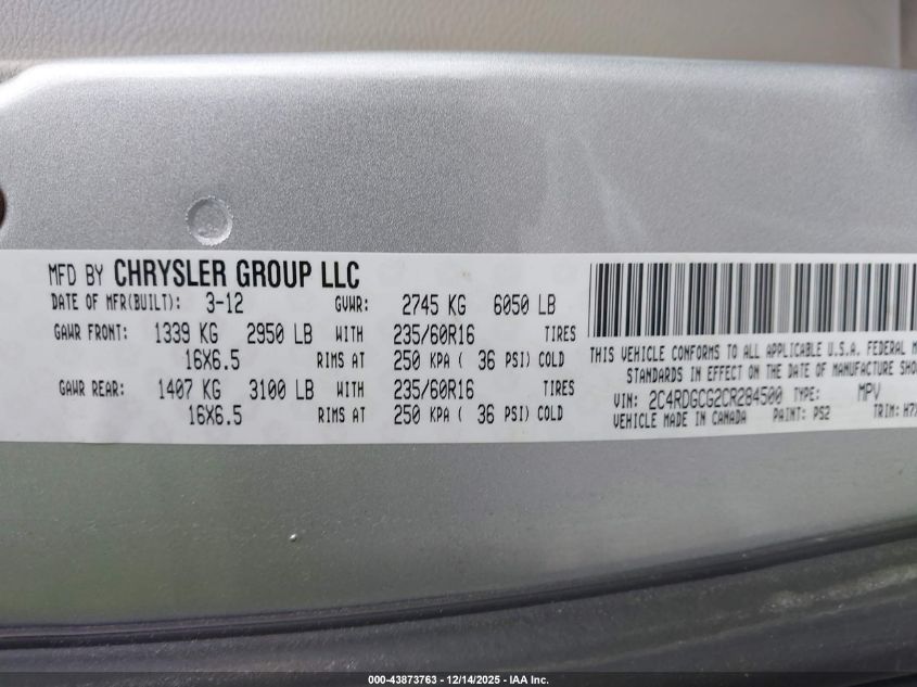 2012 DODGE GRAND CARAVAN - 2C4RDGCG2CR284500, цвет - Серебряный, 3.6, Бензин, Передний привод из США