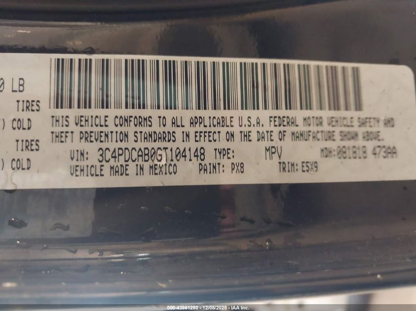 2016 DODGE JOURNEY - 3C4PDCAB0GT104148, цвет - Черный, 2.4, Бензин, Передний привод из США