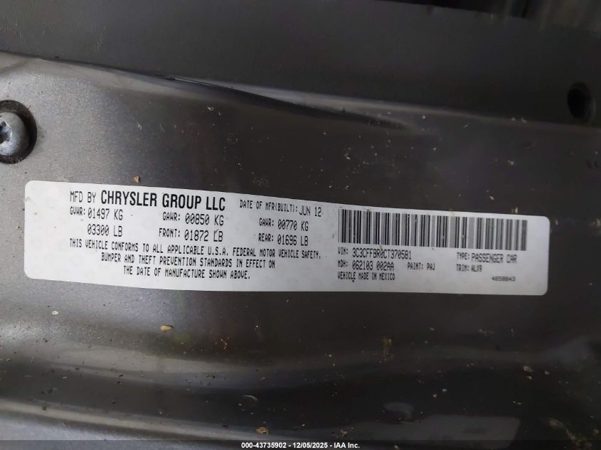 Цвет СерыйЦилиндры 4Привод Передний приводVIN 3C3CFFBR0CT370581Состояние Заводится и едет (проверено)Повреждения Обычный износДата аукциона 2025-12-18
