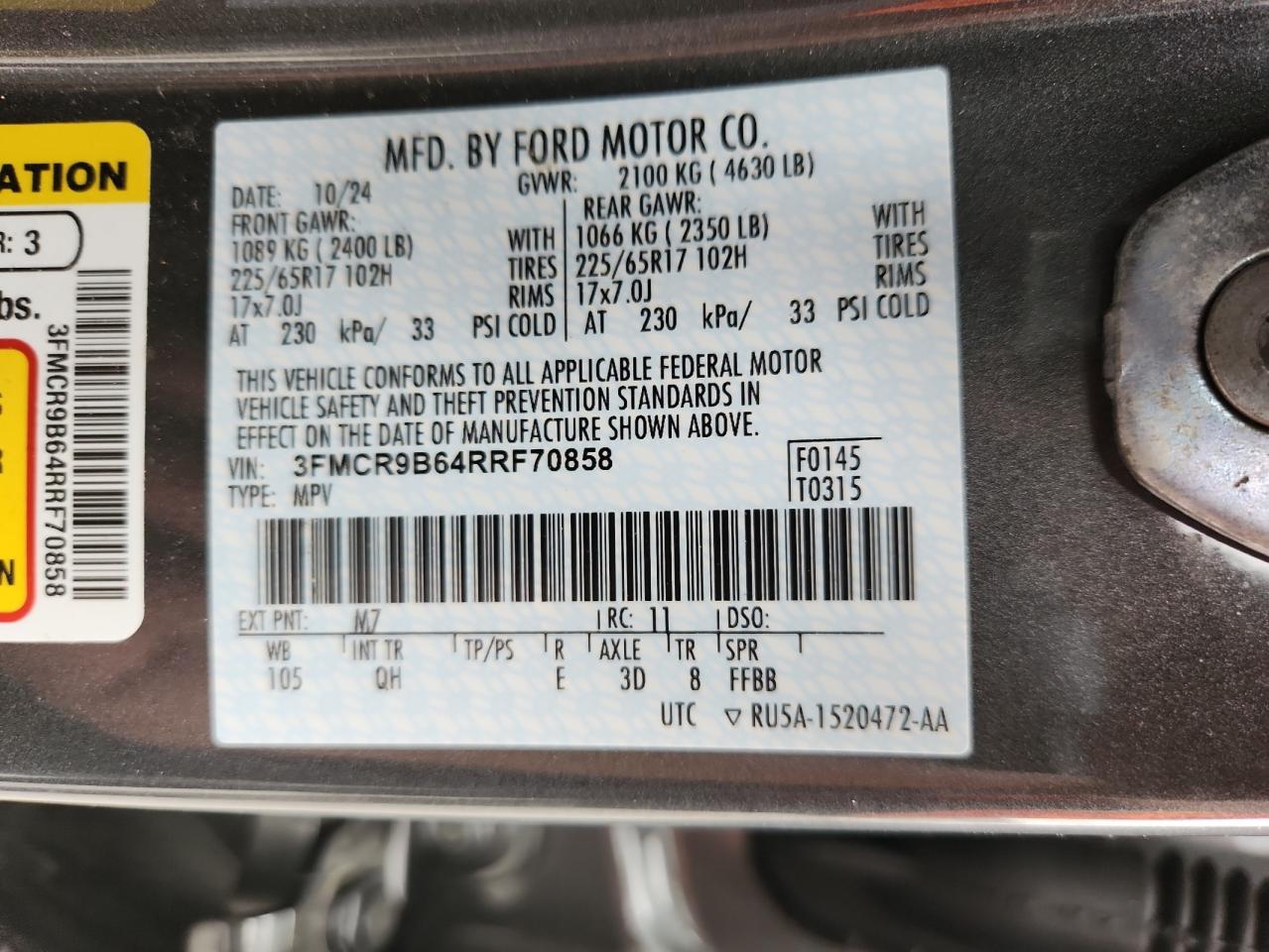 Цвет Древесный угольЦилиндры 3Привод 4x4 с передним приводомVIN 3FMCR9B64RRF70858Состояние Заводится и едет (проверено)Повреждения Передняя или задняяДата аукциона 2025-10-08