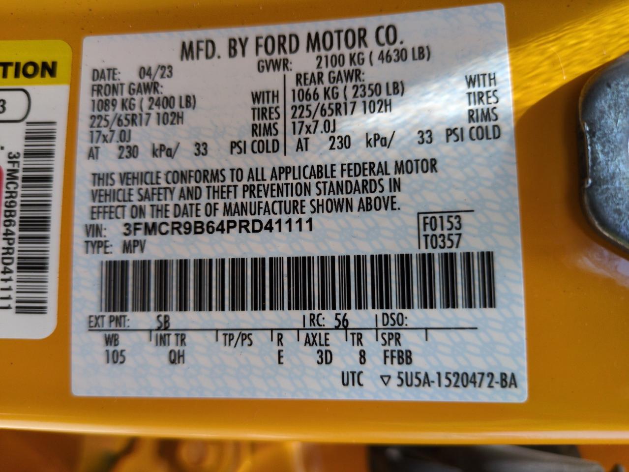 2023 FORD BRONCO SPORT - 3FMCR9B64PRD41111, цвет - Желтый, 1.5, Бензин, 4x4 с передним приводом из США