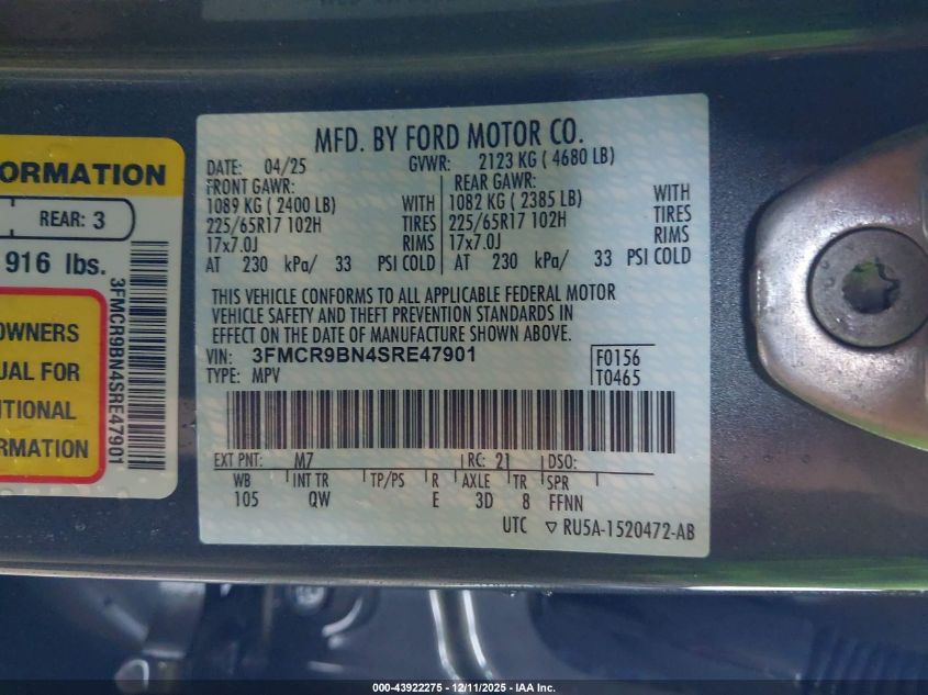 2025 FORD BRONCO SPORT - 3FMCR9BN4SRE47901, цвет - Серый, 1.5, Бензин, Полный привод из США