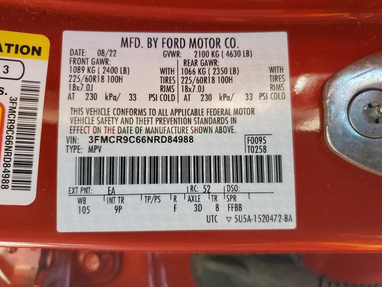 2022 FORD BRONCO SPORT - 3FMCR9C66NRD84988, цвет - Апельсиновый, 1.5, Бензин, 4x4 с передним приводом из США