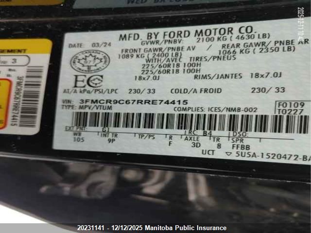Цвет ЧерныйЦилиндры 3Привод Полный приводVIN 3FMCR9C67RRE74415Состояние СтационарноПовреждения Передняя праваяДата аукциона 2025-12-17
