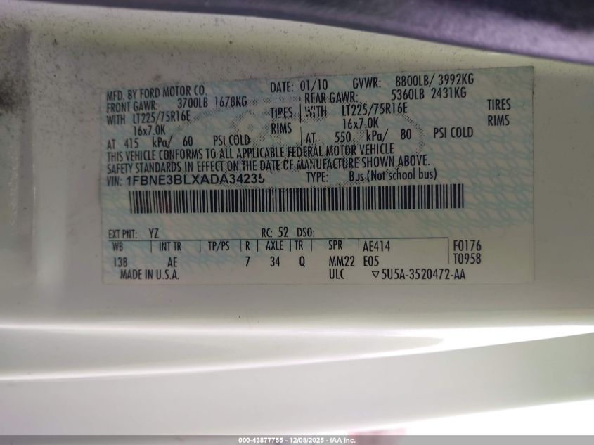 2010 FORD E-350 - 1FBNE3BLXADA34235, цвет - Белый, 5.4, Бензин, Задний привод из США