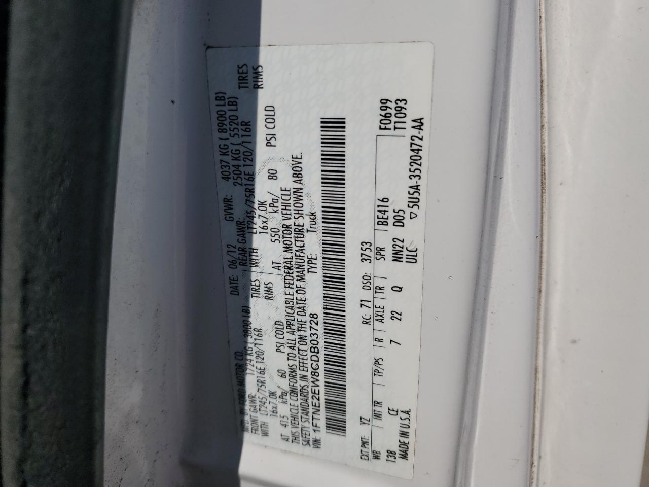 2012 FORD ECONOLINE - 1FTNE2EW8CDB03728, цвет - Белый, 4.6, Бензин, Задний привод из США