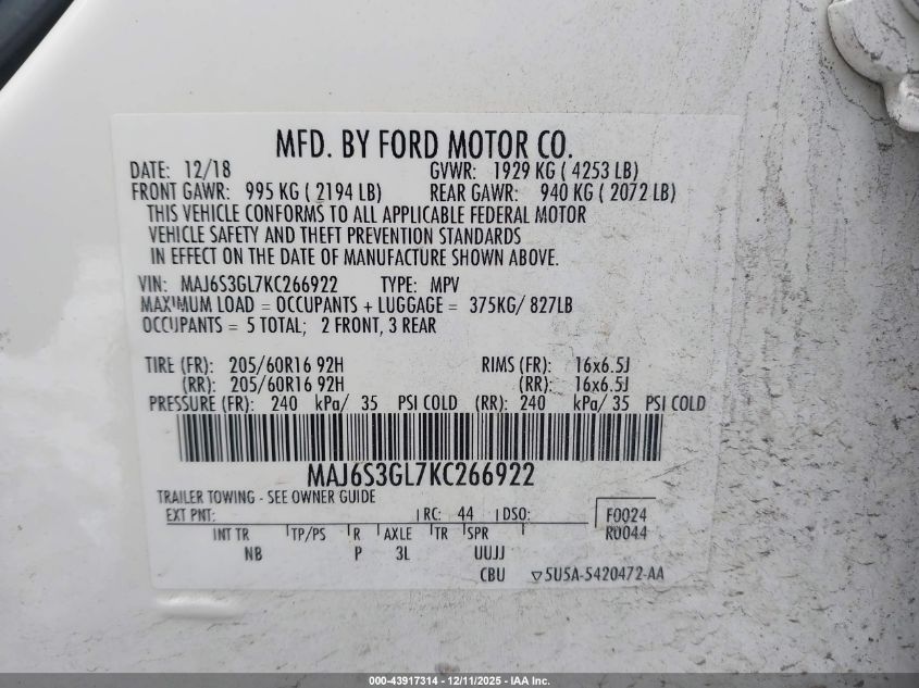 2019 FORD ECOSPORT - MAJ6S3GL7KC266922, цвет - Белый, 2.0, Бензин, Полный привод из США