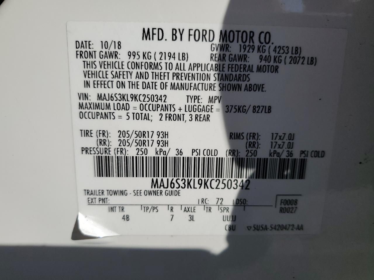 2019 FORD ECOSPORT - MAJ6S3KL9KC250342, цвет - Белый, 2.0, Бензин, 4x4 с передним приводом из США