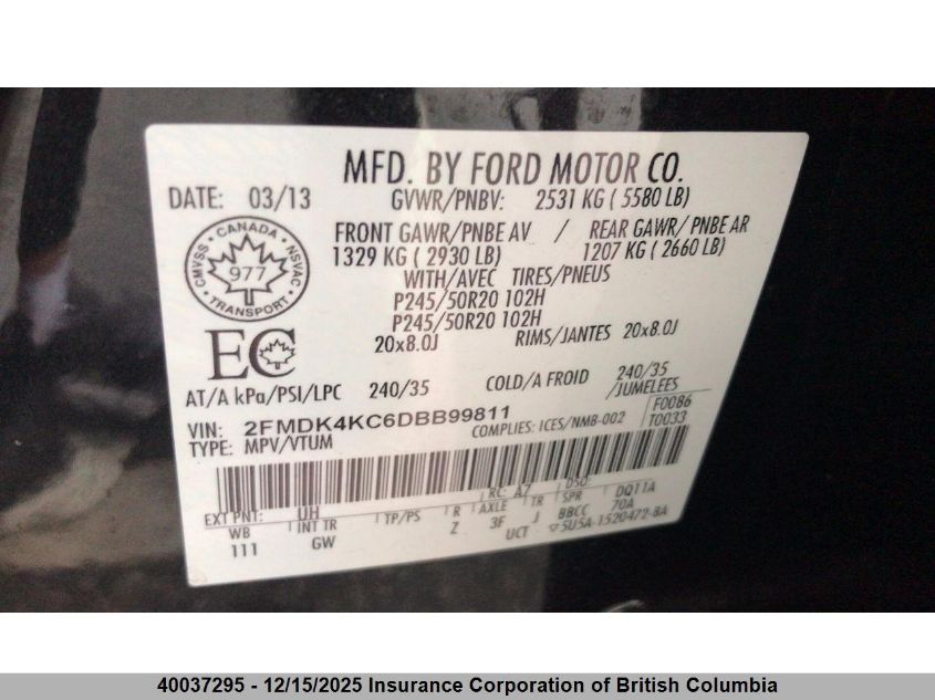 Цвет ЧерныйЦилиндры 6Привод Полный приводVIN 2FMDK4KC6DBB99811Состояние СтационарноПовреждения ПередняяДата аукциона 2025-12-17